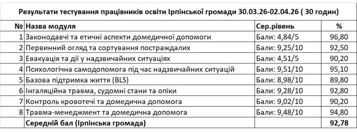 01–02 квітня 2026 року на базі Ірпінського ліцею №2 завершилися практичні заняття тематичного курсу для педагогічних працівників закладів освіти Ірпінської громади «Домедична допомога в навчальних закладах. Safe School Project».